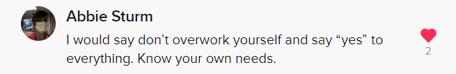 Abbie Sturm tells us: I would say don’t overwork yourself and say “yes” to everything. Know your own needs.