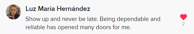 Luz Maria Hernandez tells us: Show up and never be late. Being dependable and reliable has opened many doors for me.