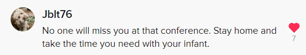 Jblt76 advises: No one will miss you at that conference. Stay home and take the time you need with your infant.